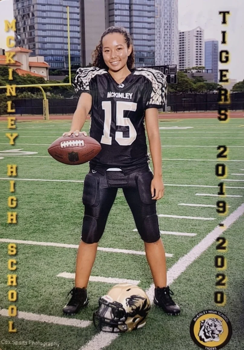 I was born in San Francisco in 2002, but Hawai‘i has been home since I was three. I’m a proud public school kid (shoutout Kaʻahumanu Elementary and Washington Middle) and graduated from McKinley High School in 2020 where I made history as the first female quarterback to start a varsity football game and throw a touchdown in the state of Hawai‘i.